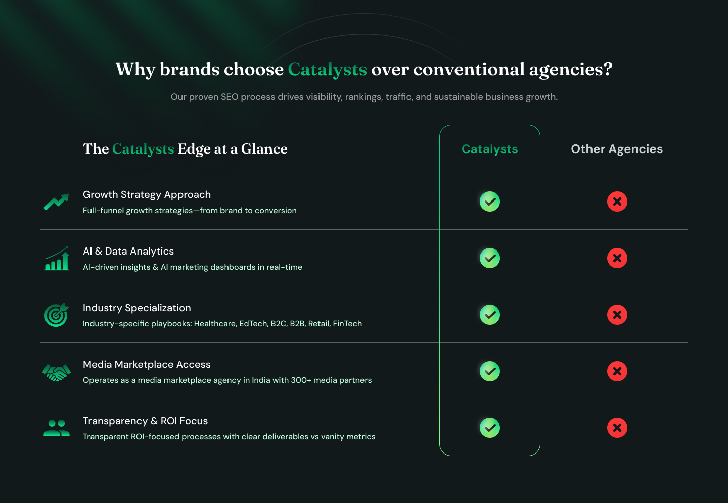 Catalysts delivers proprietary, AI-powered frameworks adapting to the realities of each sector. With vertical-specific playbooks, transparent ROI dashboards, and a media marketplace of 300+ partners, we enable leadership teams to scale with precision, speed, and accountability.